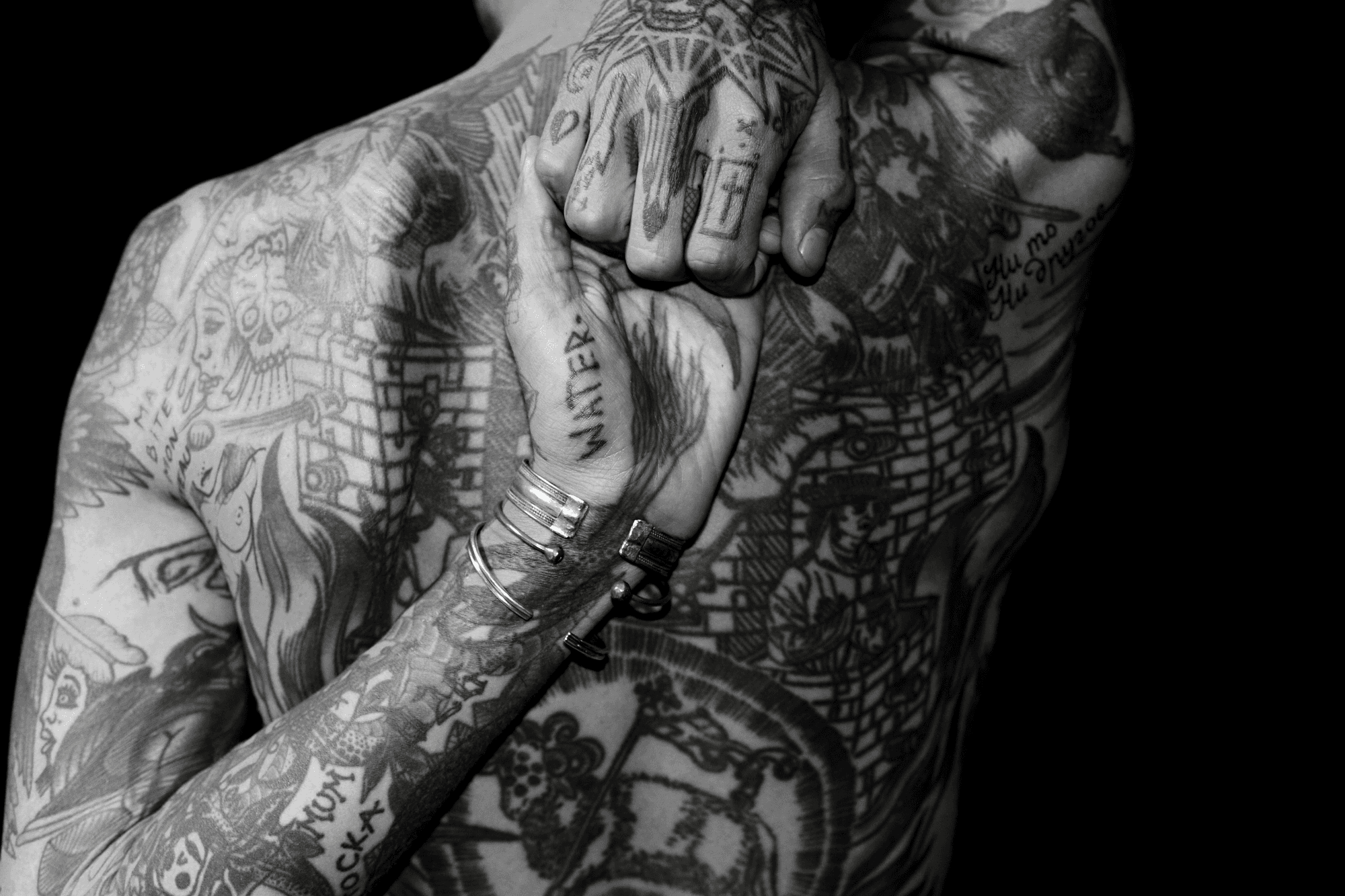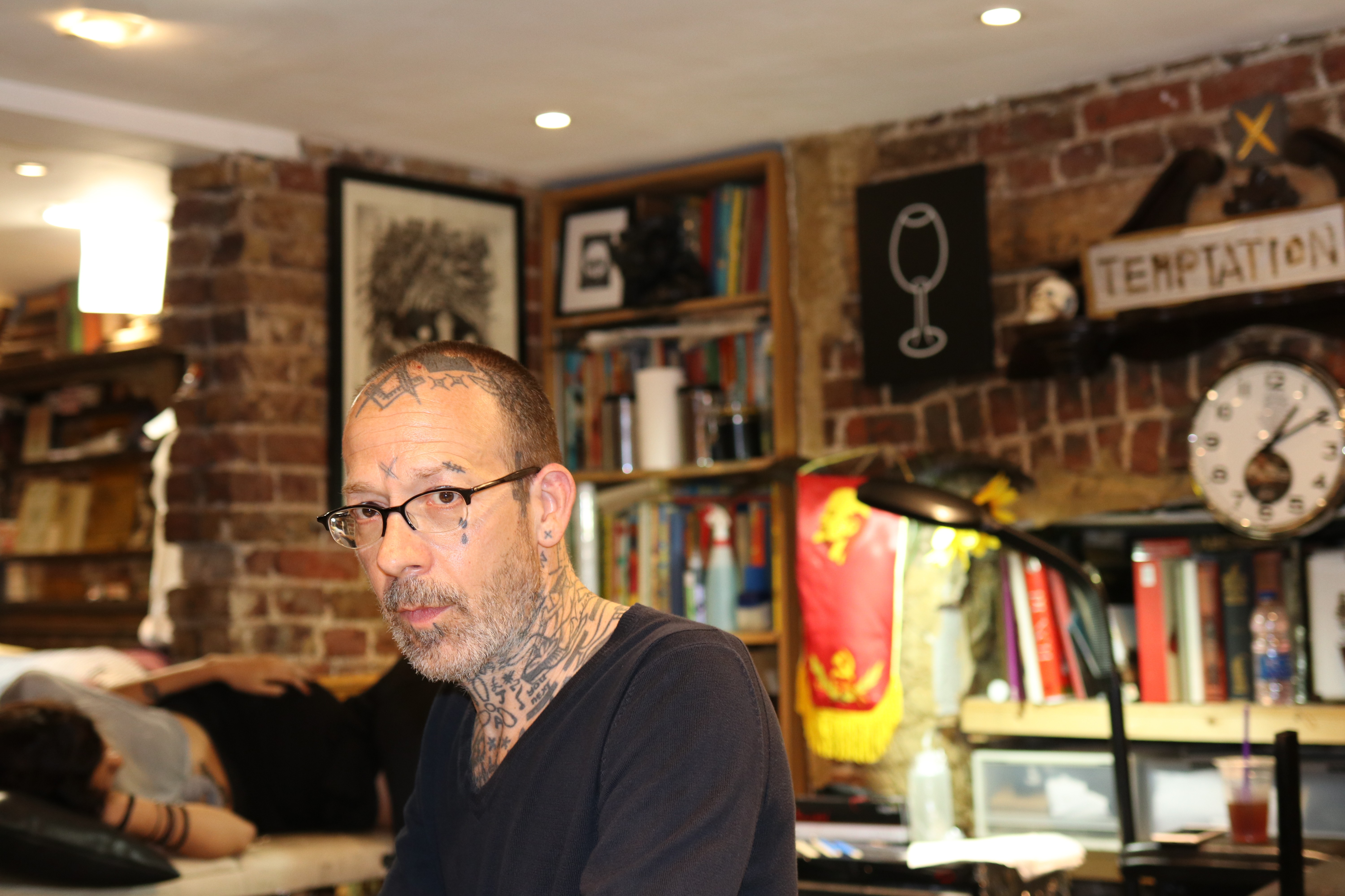 There is a method to his madness and it is of purity far stronger than the pills and potions he necks to fuel it, which is often all that is spoken of. For Sparkes, everything comes from the same cauldron, so everything must go in. Brutal tattoos, it seems, require a thick broth of experience for the applicator to draw from to ensure authenticity. “That’s the truest… that’s integrity at the end. That’s the only way you should be. You have to do everything, with everything. You have to use everything you have as one thing. I couldn’t see it any other way really. You embody your art,” he explains. Sparkes doesn’t so much personify his art – he is it in its crudest form, exorcised and ready to die again. His body is a museum of the etchings of the early blackwork pioneers, Duncan X and Thomas Hooper, and his style owes a lot not only to them, but his grandparents stories, which are the genesis of everything. Collecting tattoos, Sparkes opines, is a “destruction and an ornamentation of the body”. “I realised when I started getting tattooed that this body is just a vessel and you can do whatever you want with it, and I was like, ‘why didn’t I destroy it sooner?’” Everyone, Sparkes later explains stoically, “Deserves a chance to be destroyed”. War craft were among the first things Sparkes drew as a kid. Soldiers later became thugs, the ugliness of their pronounced brow won him over: “It just looked better. And I guess that kind of works with the tattooing now. Bad, ugly, shit looks better than something mega hot, mega beautiful. “I don’t know why. That’s my taste maybe. Beauty and imperfection, imperfection in beauty, maybe it’s a fascination with that.”