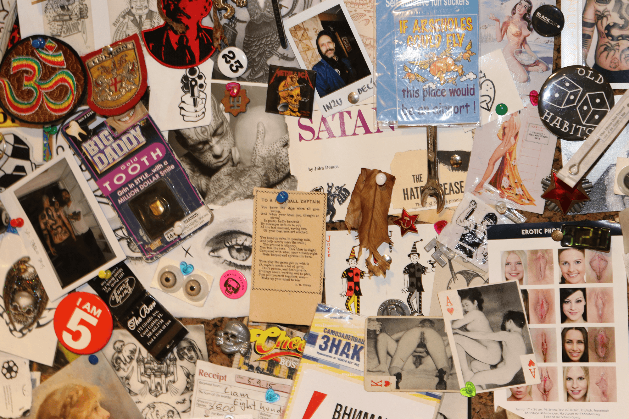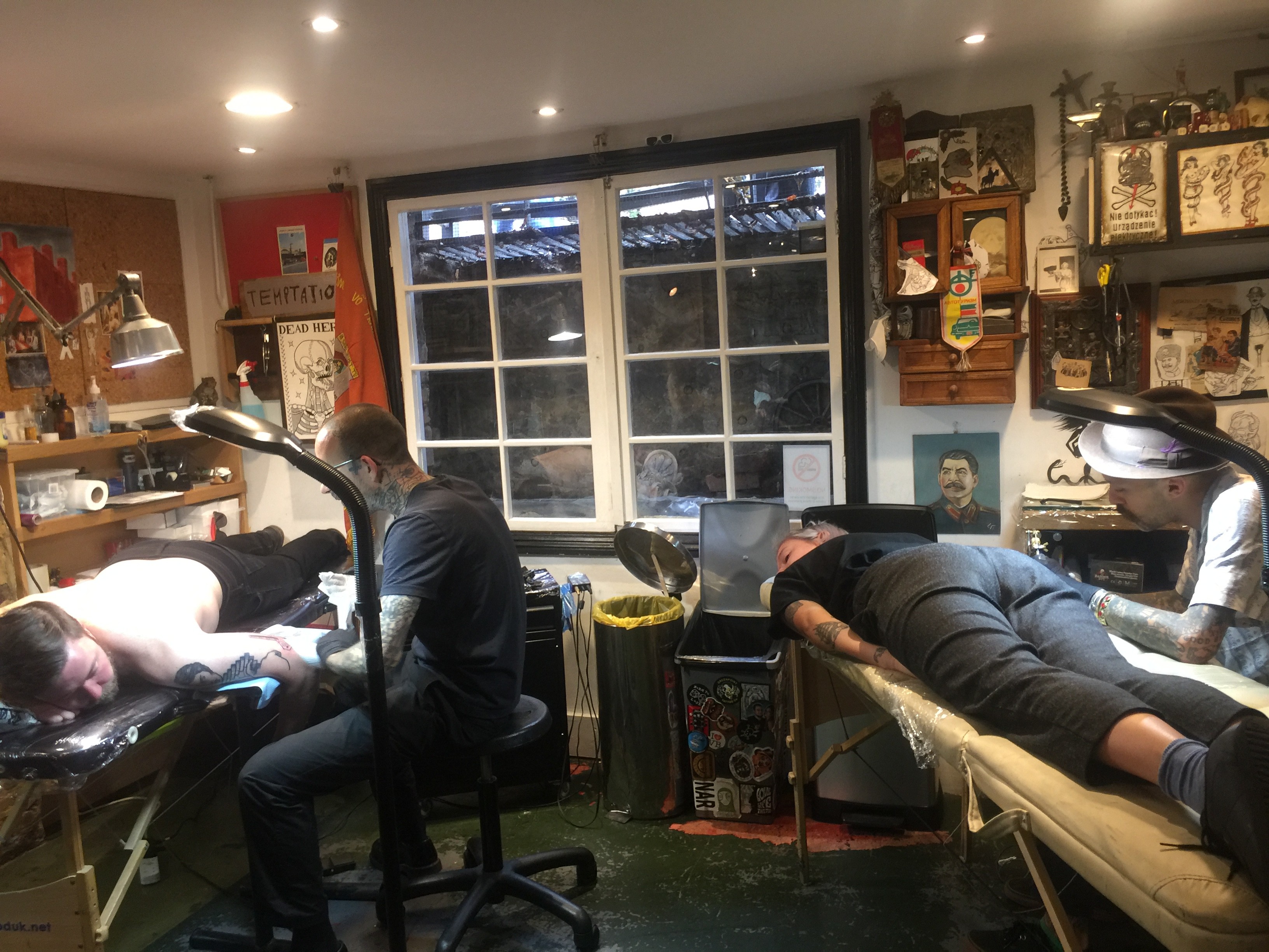 Liam Sparkes is at war – with everything. Has been since he was a boy. Age 11 he sent a sketch of an armoured personnel carrier to the Queen. The London tattooist, raised on tales of conflict from grandparents who had manned frigates and parachuted behind enemy lines during the war, thought she might need it. She didn’t. Slouching on the reception couch at Old Habits Tattoo, the east London parlour on Kingsland Road for which he is proprietor, Sparkes’ stories all tail-back to battle and even his 10-eye military boots, like his body, bear the scars of many tours of, not so much duty, but debauchery, for the 38-year-old’s appetite for destruction largely sees him seek and destroy – himself. “I feel like life is war. It definitely feels like it, in every sense of the word,” he says fanging back fags. “Going away to foreign countries. Fighting a war there. Getting a chopper out. Getting sewn back up at home base, then going back out for more. I like to go hard really and I really don’t know when it will stop.” Sparkes’ party-boy reputation is well earned but it is a sideshow in the circus of his creative process that sees him dowsing in the darkness of his urges and sifting through the ashes of experience for the essence of his art. Not the beautiful kind that’s instantly admired and easily forgotten, but the brutality and absurdity imbedded in the ugly that sits in the throat and stains the subconscious. “I am working 24/7,” he explains of his all-consuming approach that sees his art not so much imitate his life, but become it: “All the shit that I like to go and do comes out.” (Sparkes’ Instagram stories have the kaleidoscopic-styling of an acid trip – actuality not accidentally achieved by the auteur.) He adds: “It’s more just a lust for life and I just feel like I need to get shit done, sooner rather than later, and thus the war on time, the war on myself, the war on life. War.” Sparkes is admirably liberated and earnest as his eyes are blue in his pursuit of not only pleasure but professional and personal fulfilment.