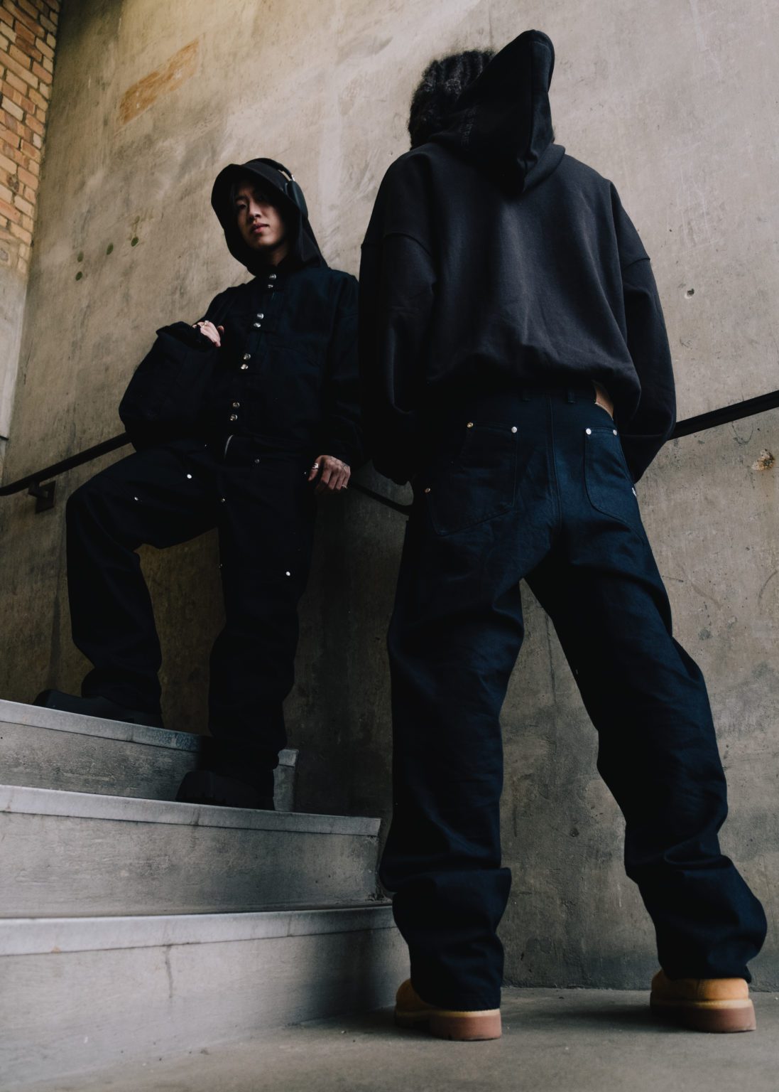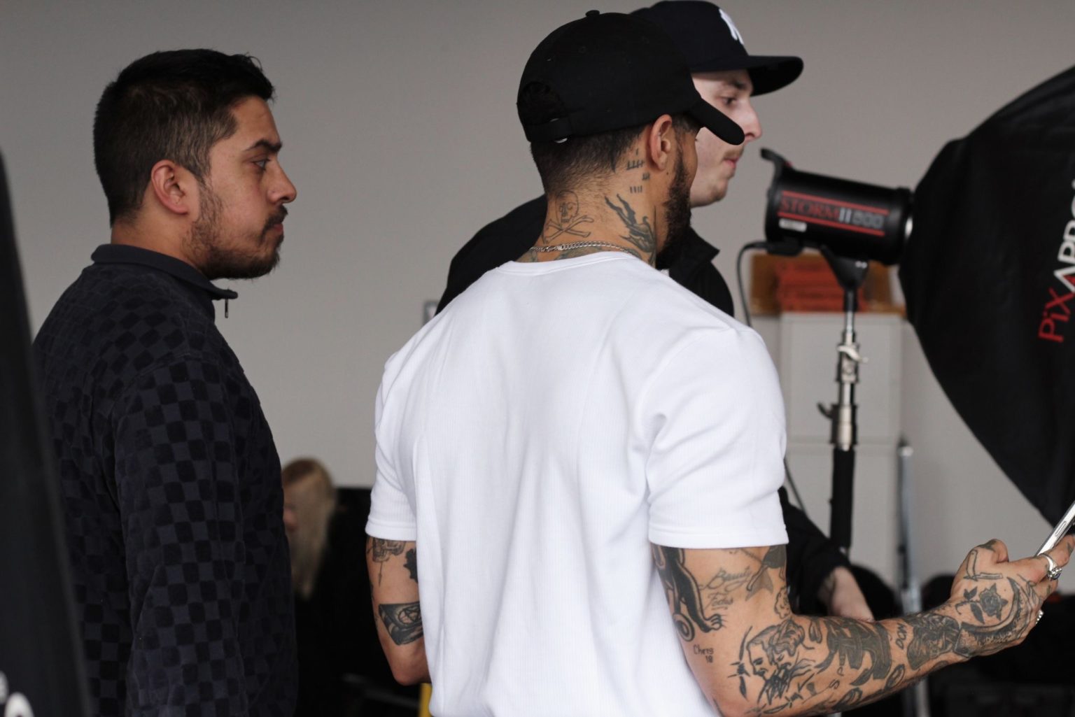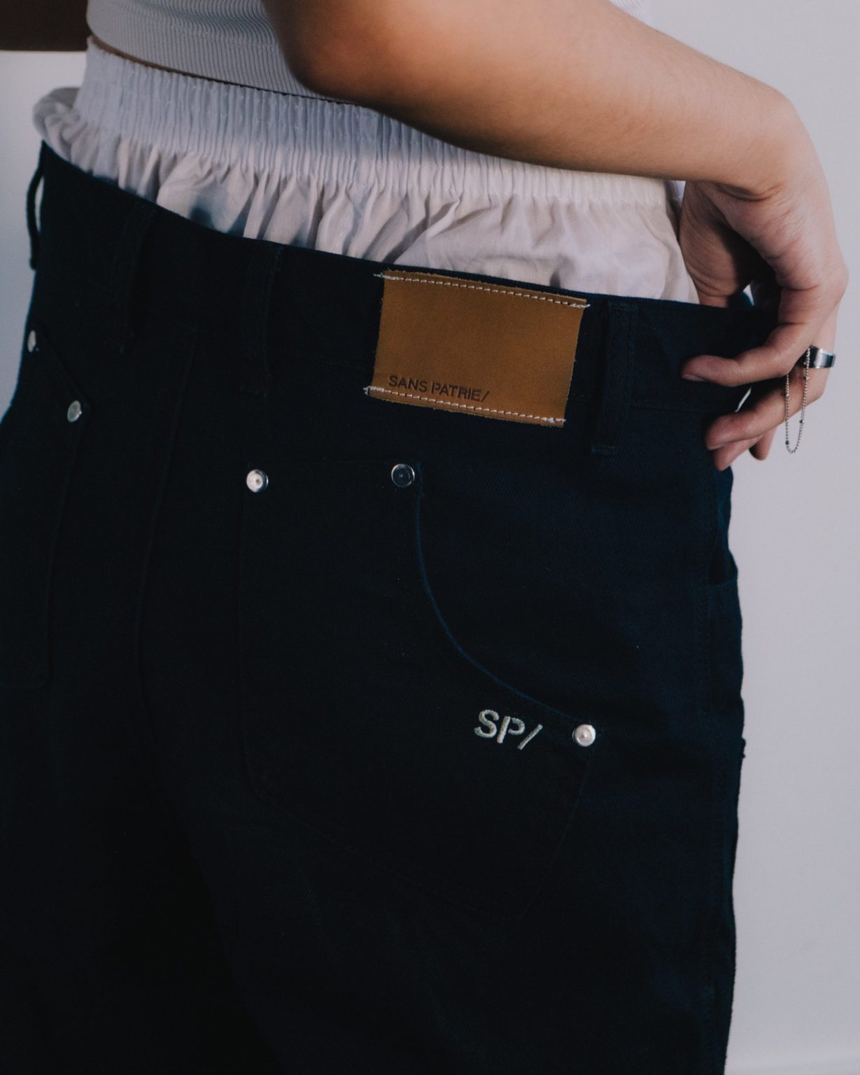 Later this week, Delphin Musquet will release the first items of his Sans Patrie fashion line realising a dream years in the making and unifying his business ventures. Musquet, the founder and creative director of the Shoreditch, London, tattoo studio of the same name, has hired Farhad Hakim to help design the collection. Hakim has worked with major brands including Adidas and Reebok, spent time on Saville Row, and was the go-to designer for Lucien Clarke during the period the skateboarder and creative got sponsored and walked the catwalk for Louis Vuitton, and launched his brand, DCV87. The first drop of the Sans Patrie collection is still being finalised, but Musquet says the brand hopes to launch a full outfit on February 24 and “refine and build” from there. The maiden range is denim and consists of a cropped, collarless, up-cycled-look jacket with snap buttons; wide-leg trousers with a “cowboy, carpenter-style (double-knee) front” – but with the overlay raised to thigh-height – a cropped hoodie that also “catches” on the shoulder to offer the perfect boxy-fit and a tailored shoulder bag with pockets. The collection has minimal branding, is dark, made to last, and “look better as it ages”. It’s inspired by skateboarding culture, “guided by nostalgia”, but the cut and fit elevate the items beyond the streets and give them a kaleidoscopic quality so they can dial up, or down, an outfit. “I want to take things back to where it all started for me, when we were skating,” Musquet explains, “With the baggy jeans. With everything about comfort. Going back to our roots and re-creating what we were wearing then.”