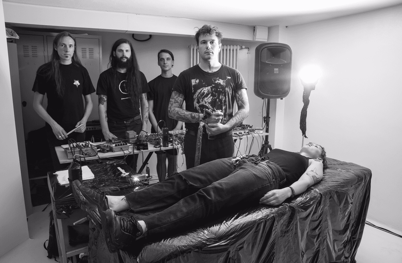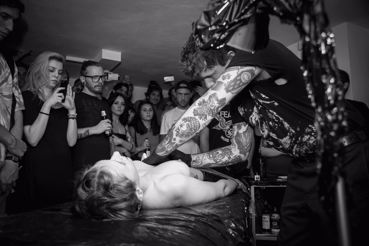 On a massage table he laid, rigid as a corpse, dressed only in chinos and trainers as a camera hovered above his eye-line, focused on his chest. A shoji screen shielded his feet as a student-flat party of scenesters in black satin, denim, leather and lace, gathered around his neck swilling wine from disposal cups, eager for the composer of this Frankenstein-esque scene to begin his work. Outside, on Dalston Lane, east London, equal numbers dressed black as a funeral procession buzzed like moths beneath the Sang Bleu sign as they sucked back cigarettes on a Monday evening in late February. Holding a tattoo machine like a scalpel Michele Servadio began to mark his canvas of flesh as a rumbling soundscape searched for a rhythm and the screens reflected his work. Like a jackhammer the gun dislodged pigment, setting off car alarms like a thief in a car park, shattering brick walls and whipping the air into gale force winds as the subject’s father edged through the crowd: “Sorry, that’s our son… I’m just wondering what they’re doing to him”, he offered, apologetically, as his boy became an instrument of industrial sound.Reaching a Mad Max climax the images on the screen reverberated as Servadio dug deeper, as if sawing-open the sternum with an angle grinder, fracking for his subject’s soul, as sonar sounds echoed and the procedure ricocheted across a dozen iPhone screens. Black rubber gloves smear black ink across the subject’s chest like a finger painting as the music climbs the high canopies of consciousness into metaphysical recesses and dreamscapes. The boy’s chin is high, his throat soft as tissues, as Servadio stands above him examining his work – an abstract scribble. Silence gives way to howling applause as his subject stands, slight as spaghetti, and poses for pretty girls with fancy cameras and a pink-haired lad with a gold retro cell phone charm earring who secures his skateboard like a baguette under his arm as he steals a few digital keepsakes of the evening. The subject’s dad gives a thumbs-up as the skater retreats into the crowd and tries to impress a girl with talk of having his dick inked. Reaching a Mad Max climax the images on the screen reverberated as Servadio dug deeper, as if sawing-open the sternum with an angle grinder, fracking for his subject’s soul, as sonar sounds echoed and the procedure ricocheted across a dozen iPhone screens.