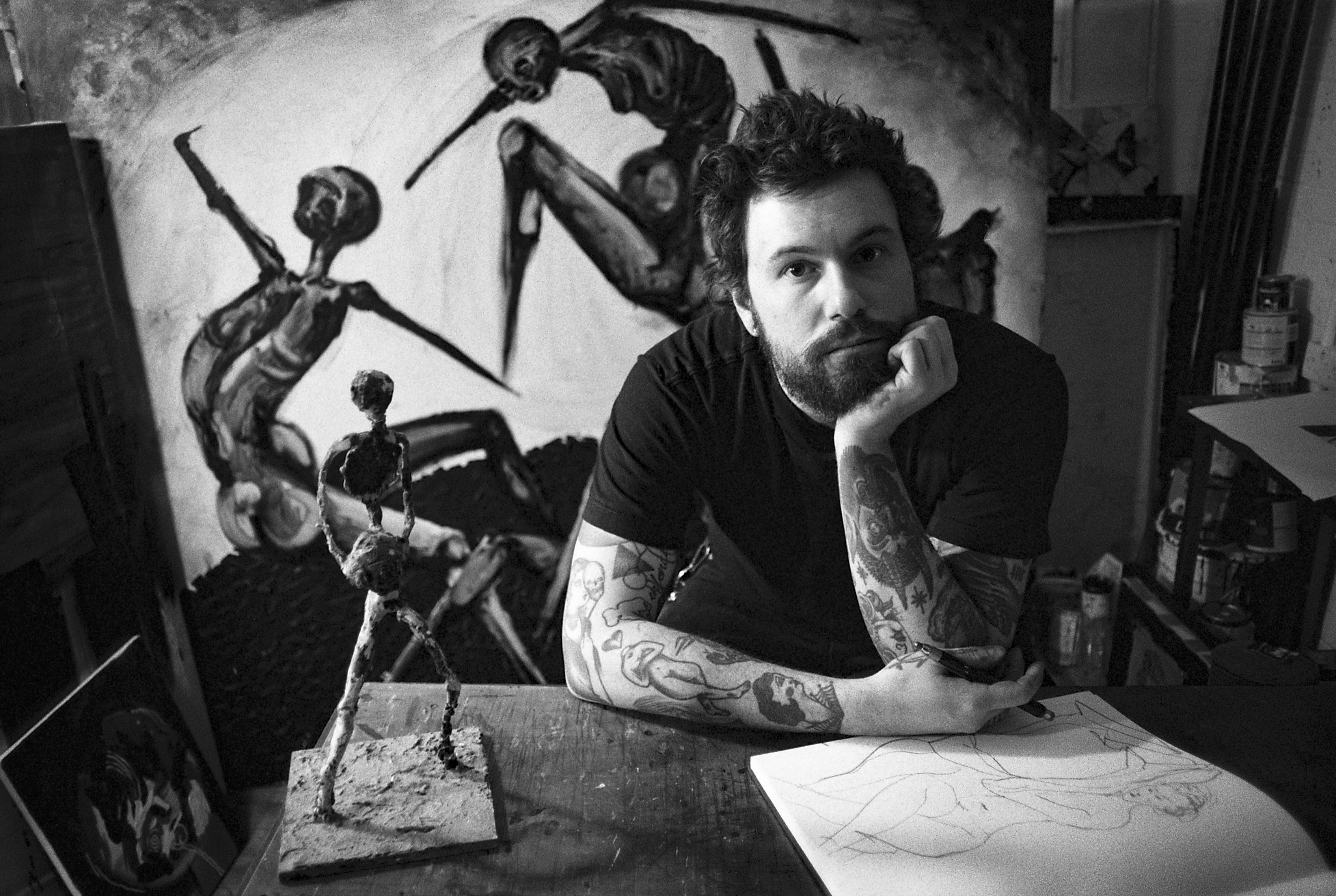 Black rubber gloves smear black ink across the subject’s chest like a finger painting as the music climbs the high canopies of consciousness into metaphysical recesses and dreamscapes. The boy’s chin is high, his throat soft as tissues, as Servadio stands above him examining his work – an abstract scribble. Silence gives way to howling applause as his subject stands, slight as spaghetti, and poses for pretty girls with fancy cameras and a pink-haired lad with a gold retro cell phone charm earring who secures his skateboard like a baguette under his arm as he steals a few digital keepsakes of the evening. The subject’s dad gives a thumbs-up as the skater retreats into the crowd and tries to impress a girl with talk of having his dick inked. Sang Bleu is a paradoxical place for Servadio to perform for he has not so much rebelled against the tattooing scene, for which the shop is a mecca, but ignored it altogether. Yet his installation – Body of Reverbs – the headline act of Maxime Plescia-Buchi’s latest project launch – TTTism, a contemporary tattooing Instagram vision realised in print – signifies his ascension and the mainstreaming of his mixed-medium exploration, which began in London with performances involving Sitex security screens – the metal sheets landlords ambitiously use to keep out squatters, which Servadio was for three years after packing a bag and his bike, to relocate, from his native Venice, in 2010. The decision was made on a whim, with a mate, having spent “three… maybe four years” at a visual arts school in Venice where he moved to escape the boredom of his hometown, a village called Arzergrande, and to develop his drawing, “the only thing I could do and the only thing I really enjoyed doing”. The course was “nothing academical”, but Servadio passed the time “mainly doing my own things… I’ve never been a good student”. He did illustrations for Punk bands, painted and skateboarded – the sport whose 80s’ skull and snake motifs – made famous by Powell Peralta’s Tony Hawk and Mike McGill – were the genesis of his early tattoo work. While initially thinking tattoos were “tacky”, Servadio nonetheless inked a jawbone on his own thigh age 20 or 21, before turning the gun on his friends. “As soon as I tried, I was like, ‘this is the thing. This is beautiful’. “Tattooing taught me to avoid what is not necessary. Minimal works.”